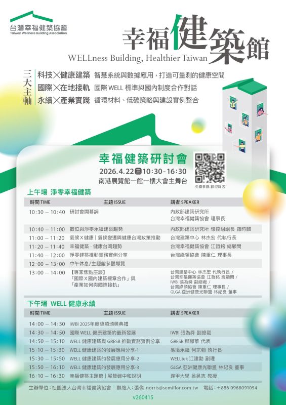 今年協會以 「幸福健築,健康台灣」 為核心,集結產官學研最前線的實踐者,透過 科技 × 國際 × 永續 三大主軸,帶領大家看見台灣與世界接軌的健康建築現場。
